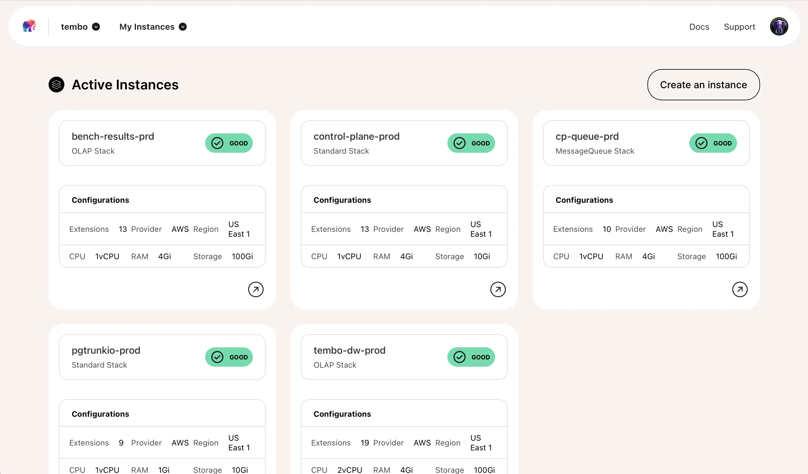 In January 2024, we shipped Tembo Cloud, a managed service to unlock the full power of the Postgres ecosystem, after a year of work by our amazing team. We have a free-forever hobby tier available. Please try it for free.